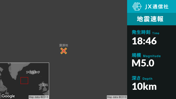 1月11日 18:46頃、アイスランドのGrindavikから南西687kmの地点でM5.0の地震がありました。