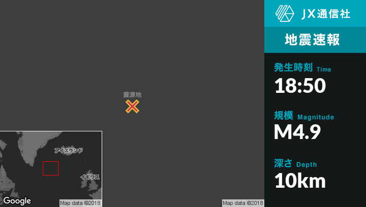 1月11日 18:50頃、アイスランドのGrindavikから南西708kmの地点でM4.9の地震がありました。