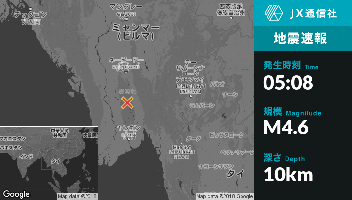 1月12日 05:08頃、ミャンマーのPyuから西33kmの地点でM4.6の地震がありました。