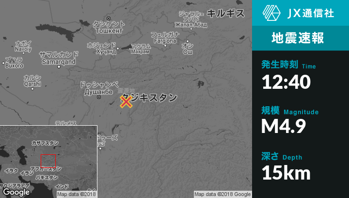 1月12日 12:40頃、タジキスタンのRoghunから南南東34kmの地点でM4.9の地震がありました。