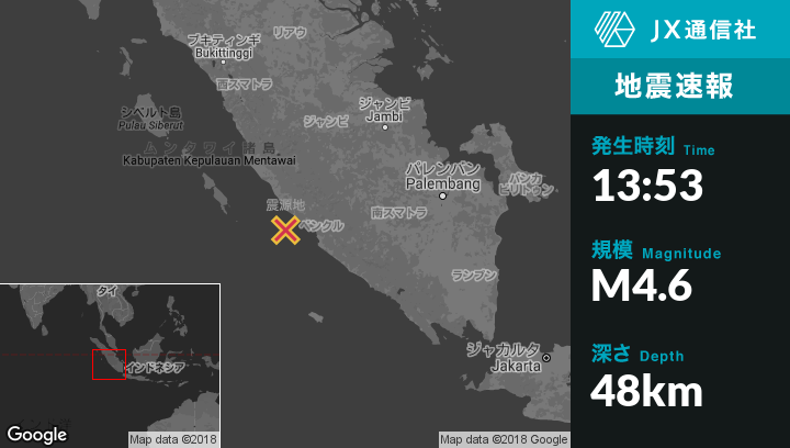 | 震源地 | インドネシアのBengkuluから西北西76kmの地点 |
