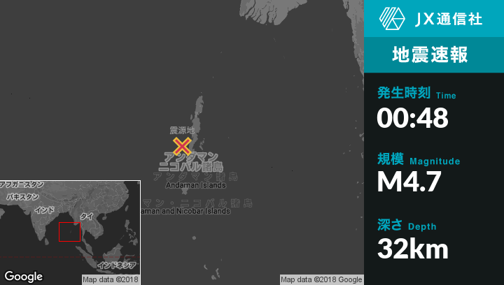 1月15日 00:48頃、インドのBamboo Flatから北西58kmの地点でM4.7の地震がありました。