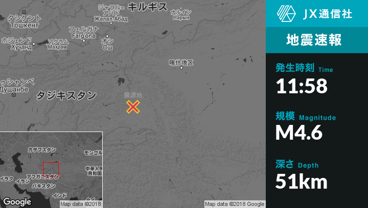 1月15日 11:58頃、タジキスタンのMurghobから北北西10kmの地点でM4.6の地震がありました。