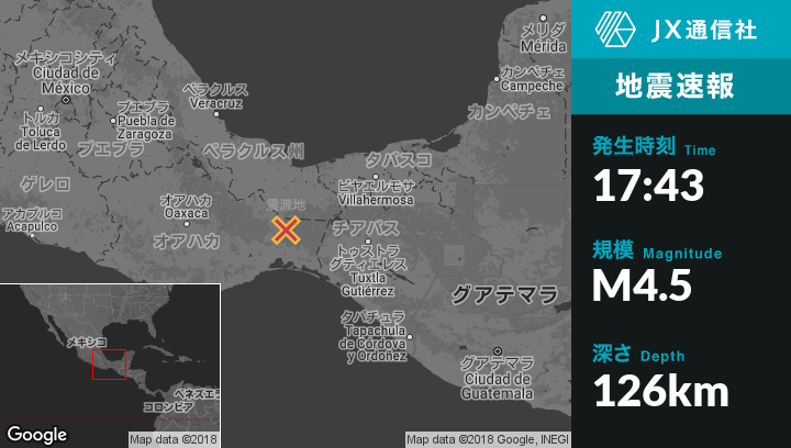 1月18日 17:43頃、メキシコのPalomaresから東南東35kmの地点でM4.5の地震がありました。