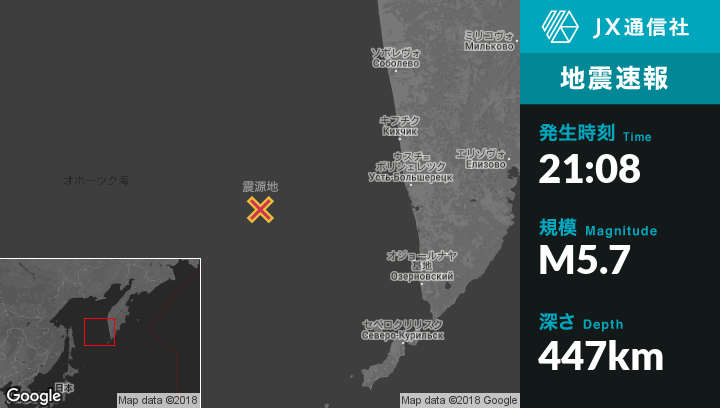 1月18日 21:08頃、ロシアのOzernovskiyから西北西270kmの地点でM5.7の地震がありました。