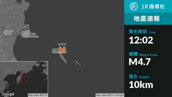 1月25日 12:02頃、ロシアのNikol'skoyeから北北東36kmの地点でM4.7の地震がありました。