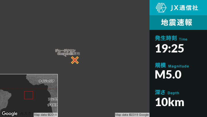1月25日 19:25頃、セントヘレナのGeorgetownから東南東82kmの地点でM5.0の地震がありました。