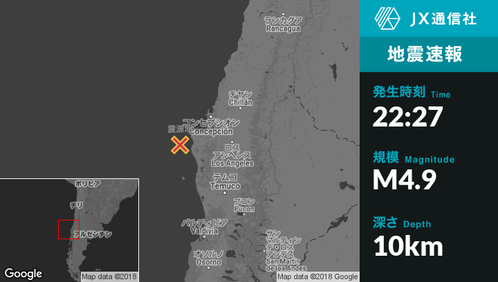 1月26日 22:27頃、チリのLebuから西北西38kmの地点でM4.9の地震がありました。