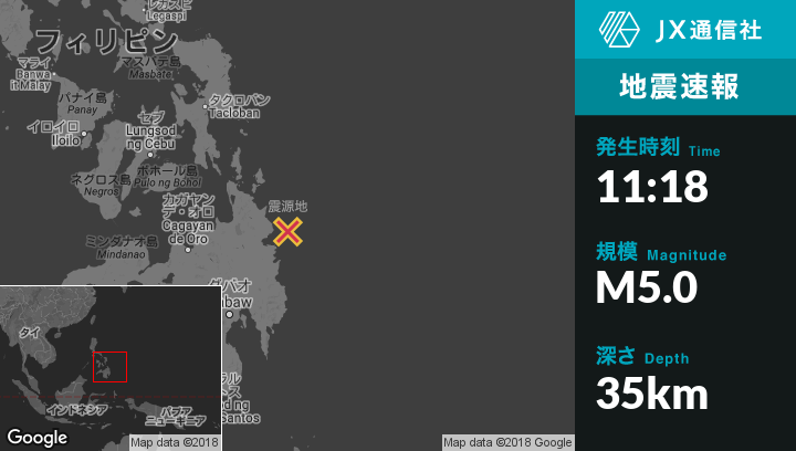 1月28日 11:18頃、フィリピンのAras-asanから東34kmの地点でM5.0の地震がありました。