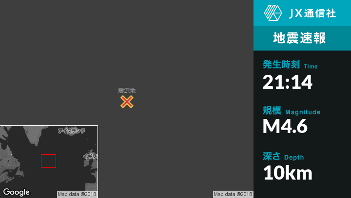 1月29日 21:14頃、グリーンランドのNanortalikから南東940kmの地点でM4.6の地震がありました。