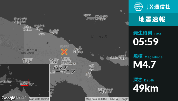 | 震源地 | パプアニューギニアのMount Hagenから北北東109kmの地点 |