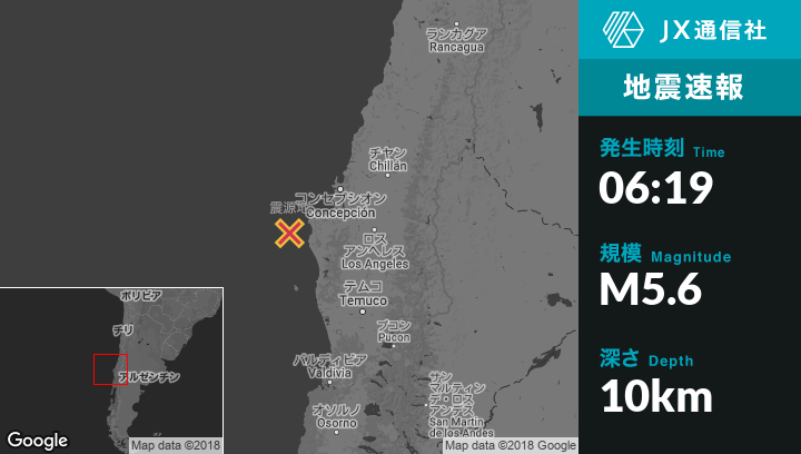 2月09日 06:19頃、チリのLebuから西北西40kmの地点でM5.6の地震がありました。