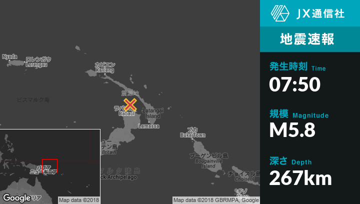 2月11日 07:50頃、パプアニューギニアのRabaulから北北西51kmの地点でM5.8の地震がありました。