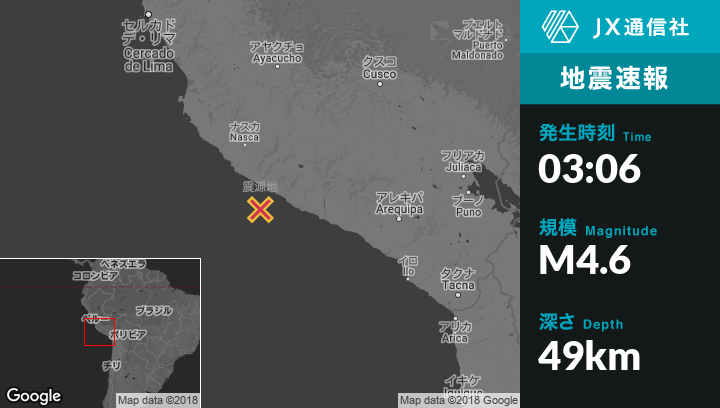 2月12日 03:06頃、ペルーのAcariから南71kmの地点でM4.6の地震がありました。