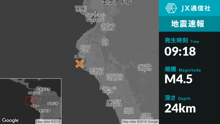 2月16日 09:18頃、ペルーのSechuraから南西35kmの地点でM4.5の地震がありました。