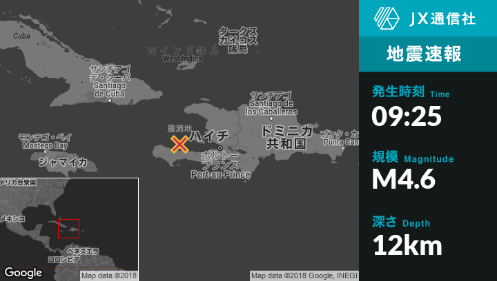 2月17日 09:25頃、ハイチのPetit Trou de Nippesから北北西34kmの地点でM4.6の地震がありました。