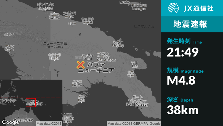 | 震源地 | パプアニューギニアのMendiから西南西57kmの地点 |