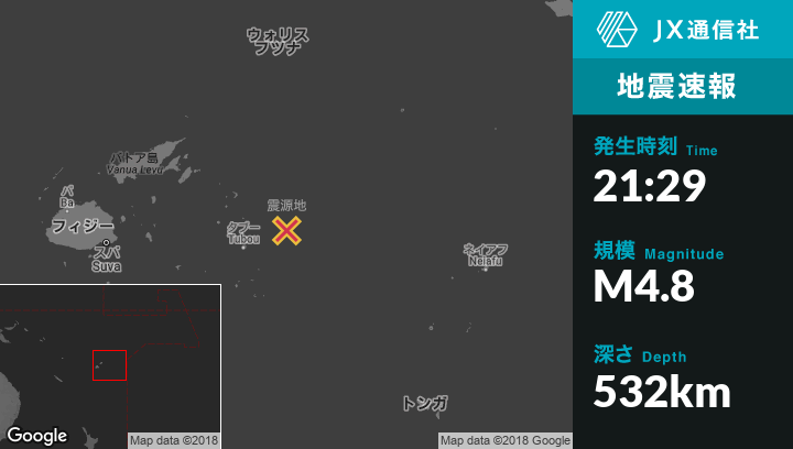 2月27日 21:29頃、フィジーのLambasaから東南東320kmの地点でM4.8の地震がありました。