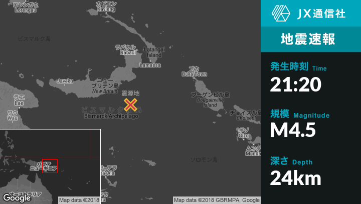 | 震源地 | パプアニューギニアのKimbeから東南東218kmの地点 |