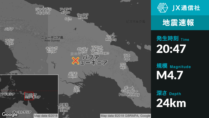 3月05日 20:47頃、パプアニューギニアのMendiから西南西71kmの地点でM4.7の地震がありました。