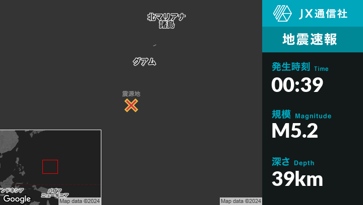11月22日 00:39頃、グアムのMerizo Villageから南南西178kmの地点でM5.2の地震がありました。