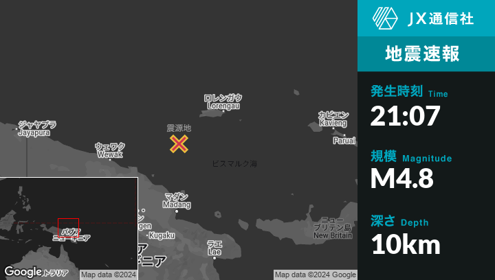 | 震源地 | パプアニューギニアのLorengauから西南西186kmの地点 |