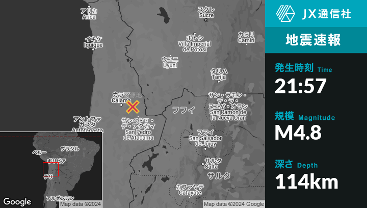 11月24日 21:57頃、チリのCalamaから東50kmの地点でM4.8の地震がありました。