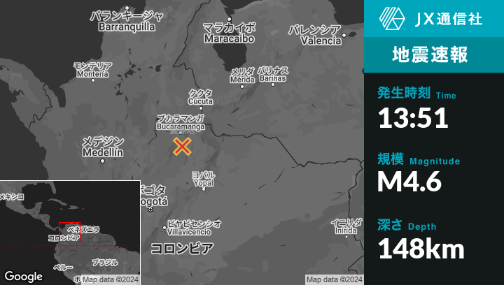 | 震源地 | コロンビアのJordánから北8kmの地点 |