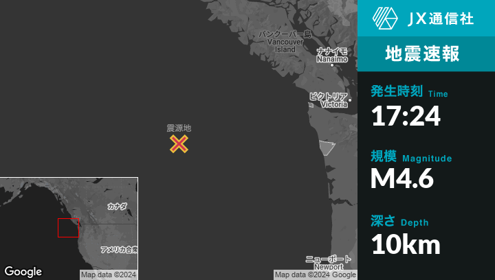 11月25日 17:24頃、カナダのTofinoから南西279kmの地点でM4.6の地震がありました。