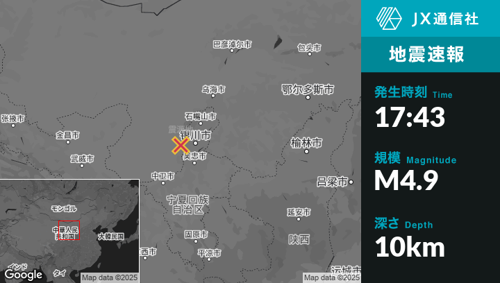 1月02日 17:43頃、中国のBayan Hotから南南東34kmの地点でM4.9の地震がありました。