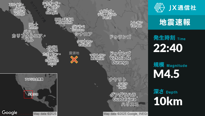 | 震源地 | メキシコのLas Arenitasから南西119kmの地点 |