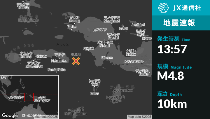 1月25日 13:57頃、インドネシアのFakfakから南西127kmの地点でM4.8の地震がありました。