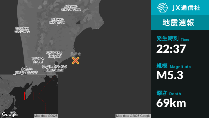 | 震源地 | ロシアのPetropavlovsk-Kamchatskyから東91kmの地点 |