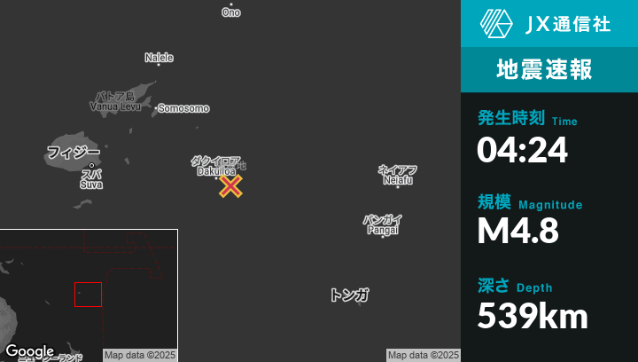 1月28日 04:24頃、フィジーのLevukaから東274kmの地点でM4.8の地震がありました。