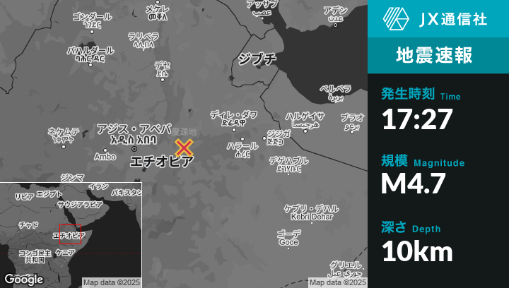 2月27日 17:27頃、エチオピアのĀwashから北東25kmの地点でM4.7の地震がありました。