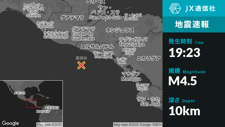 2月27日 19:23頃、エルサルバドルのLa Libertadから南南西110kmの地点でM4.5の地震がありました。