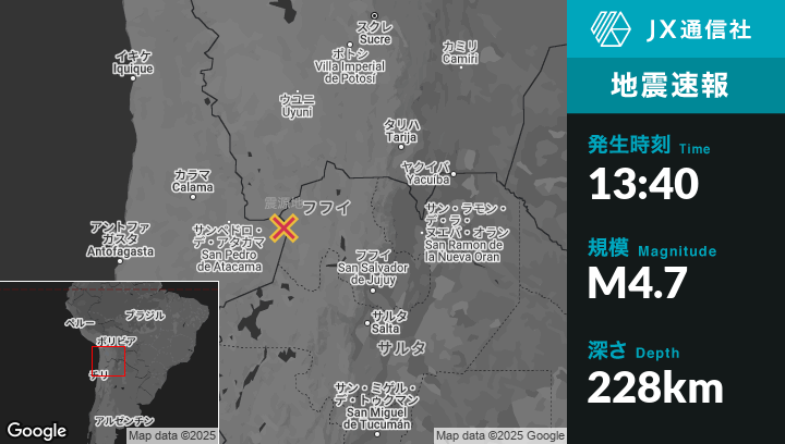 3月03日 13:40頃、チリのSan Pedro de Atacamaから東112kmの地点でM4.7の地震がありました。