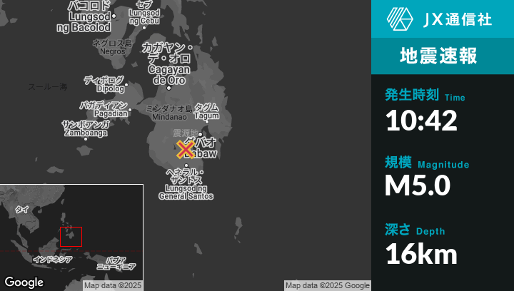 3月04日 10:42頃、フィリピンのMagsaysayから南南西5kmの地点でM5.0の地震がありました。