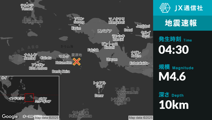 3月07日 04:30頃、インドネシアのFakfakから西南西151kmの地点でM4.6の地震がありました。