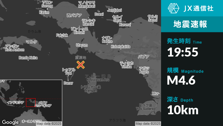 | 震源地 | インドネシアのTualから北東139kmの地点 |