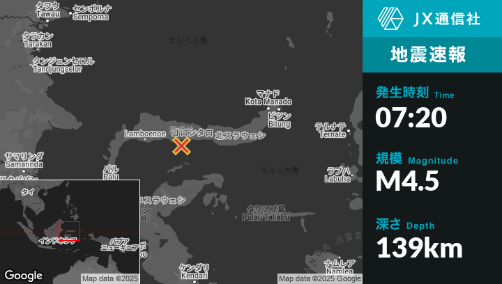 | 震源地 | インドネシアのGorontaloから西107kmの地点 |