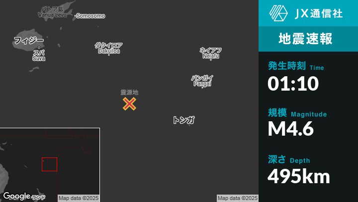 | 震源地 | トンガのHoumaから西北西253kmの地点 |