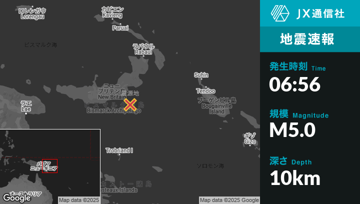 | 震源地 | パプアニューギニアのKimbeから東南東174kmの地点 |