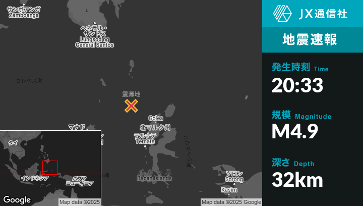 | 震源地 | インドネシアのTobeloから北西173kmの地点 |