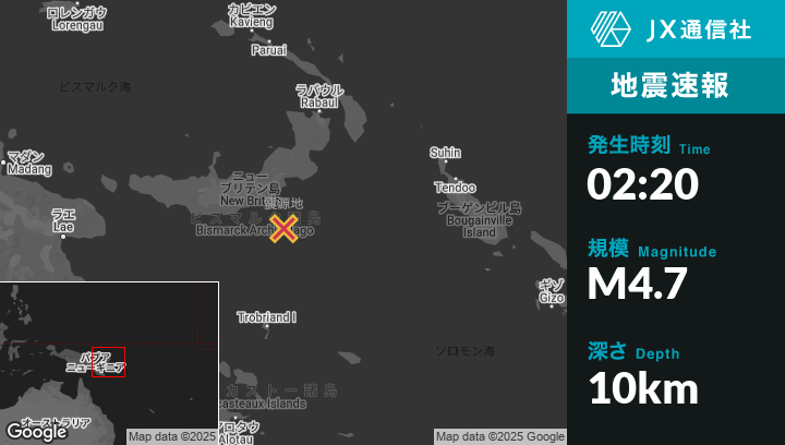 | 震源地 | パプアニューギニアのKimbeから南東172kmの地点 |