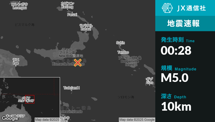 | 震源地 | パプアニューギニアのKimbeから東南東179kmの地点 |