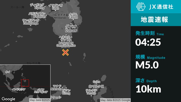 | 震源地 | フィリピンのSaranganiから南南西86kmの地点 |
