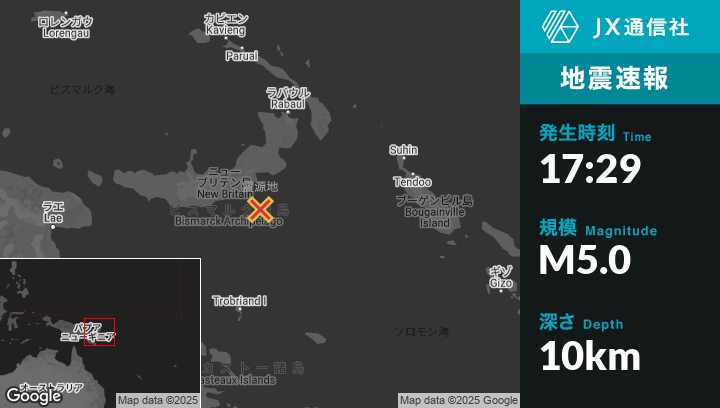 | 震源地 | パプアニューギニアのKimbeから東南東170kmの地点 |