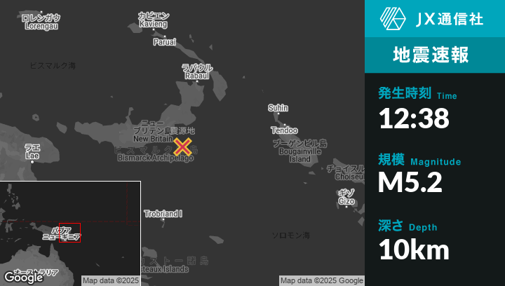 | 震源地 | パプアニューギニアのKimbeから東南東183kmの地点 |