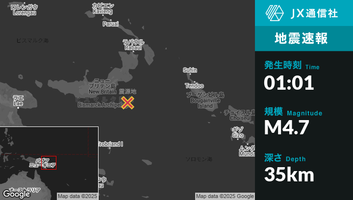 | 震源地 | パプアニューギニアのKimbeから東南東213kmの地点 |